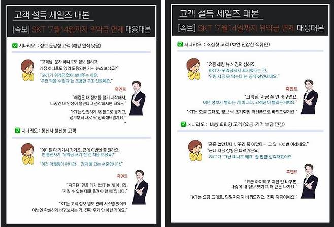 6일 업계에 따르면 한 통신사의 SKT 위약금 면제 조치 관련, 유통망 고객 대응 시나리오에는 "SKT가 위약금 없이 보내주는 이유는 '우린 막을 수 없다'는 조용한 구조 신호"라고 적혀 있다. 여기에 "해킹은 내 정보를 털기 시작해서 나중엔 내 인생이 털리는 것" "가만히 있는 게 가장 위험한 선택" 등의 자극적인 대응 멘트도 포함됐다.