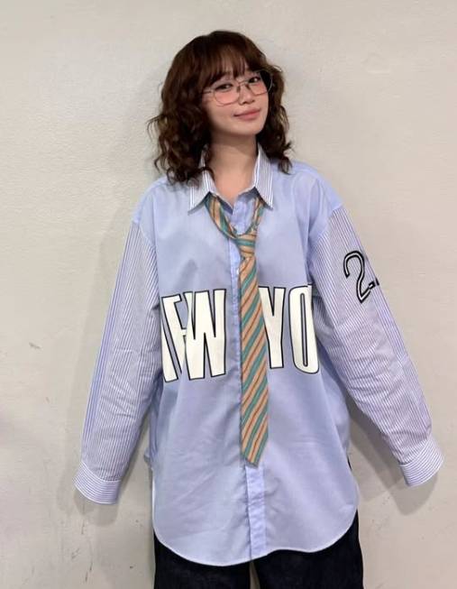 오버 사이즈의 스트라이프 셔츠에 톤온톤 계열의 넥타이를 매치해 자유롭고 유니크한 분위기가 한편으로는 보이시한 매력을 자아내기도 한다.