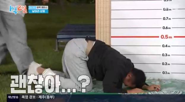 이날 멤버들은 야외 취침 아이템을 두고 대결을 펼쳤고, 2라운드에서는 제한시간 30초동안 상체 일으켜서 더 높은곳에 보드마카를 찍는 사람이 이기는 '날아라 상체' 게임을 진행했다.