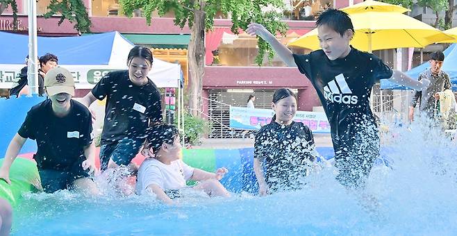 | ‘2025 세계양궁선수권대회 성공기원 시·도민 페스티벌’과 차 없는 거리 행사가 함께 열린 지난 5일 동구 금남로에서 아이들이 무더위를 날려줄 풀장에서 물놀이를 즐기고 있다./김애리 기자 |