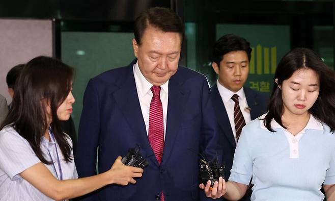 | 조사받고 나오는 尹 윤석열 전 대통령이 5일 밤 서울 서초구 서울고검에서 내란 특별검사팀의 2차 대면조사를 받은 뒤 청사를 나서고 있다. 뉴스1 |