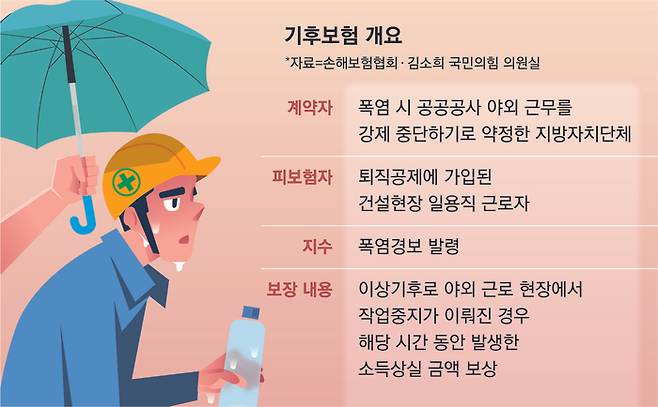 2일 김소희 국민의힘 의원실을 통해 입수한 기후보험 상품 개발안에 따르면 정부와 업계는 야외 근로자가 폭염 등으로 인해 일하지 못할 경우 소득을 보장해주는 지수형 기후보험을 개발 중이다.