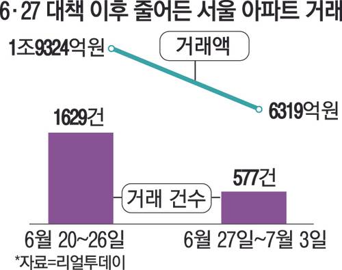 6일 부동산 전문 리서치 업체 리얼투데이에 따르면 대출 규제가 발표된 지난달 27일부터 이달 3일까지 서울 아파트 거래는 577건이 체결돼 직전 일주일(6월 20~26일)보다 64.6% 줄었다.