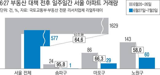 6일 부동산 전문 리서치업체 리얼투데이가 국토교통부 실거래가 공개시스템을 통해 서울 25개 자치구의 아파트 거래량을 분석한 결과, 정부의 가계대출 관리방안이 발표된 지난달 27일부터 이달 3일까지 총 577건이 거래됐다. 이는 직전 일주일(6월20~26일)의 1629건보다 1052건(64.6%) 감소한 수치다.