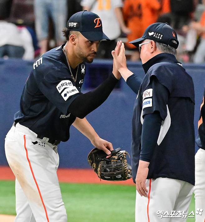 한화 타선은 7회초 다시 폭발했다. 1사 후 심우준과 이원석의 연속 안타로 생긴 찬스에서 리베라토가 우월 3점포를 외야 스탠드에 꽂아 6-0으로 점수 차를 벌린 것이다. 에스테반 플로리얼이 부상을 당하면서 6주 한도 대체 외국인 선수로 한화와 총액 5만 달러(7000만원)에 계약한 리베라토는 지난달 29일 문학 SSG전 결승 3점포, 전날 키움전 결승타에 이어 이날은 쐐기 3점포를 폭발하면서 짧은 시간에 강렬한 인상을 남기고 있다.