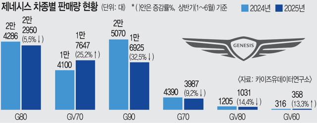 두 차종 모두 2023년 말 부분변경 모델이 나왔다. 이후 신차 효과로 지난해 상반기 판매량을 끌어올린 것에 대한 기저효과가 반영된 측면도 있다. 그러나 불과 1년 만에 판매량이 하락세로 돌아서면서 제네시스도 고민이 깊어지고 있다. 완성차 업체의 일반적인 신차 출시 주기를 고려하면 앞으로 3년 정도는 차량에 변화를 주기도 어렵다.