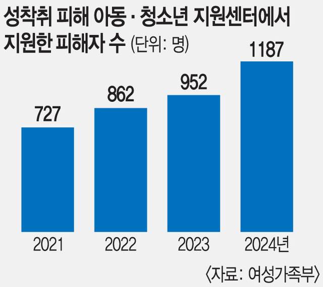 아청센터가 지원한 피해자는 2021년 727명에서 매년 증가해 지난해 1187명을 기록했다.