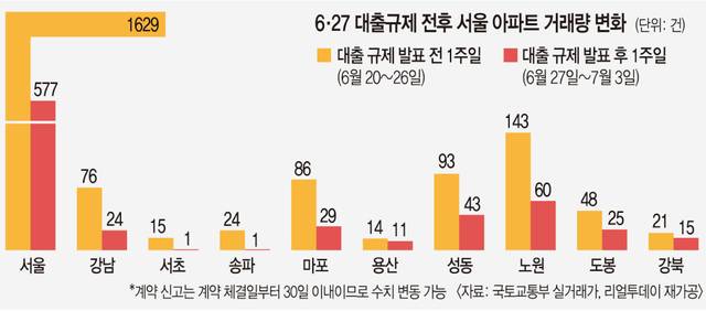6·27 고강도 대출 규제의 효과가 부동산시장에 즉각 반영되고 있다. 서울 전역에서 아파트 매매 거래량과 거래가격이 급감했고, 대출 여력이 부족한 이들의 계약취소도 속출하고 있다.