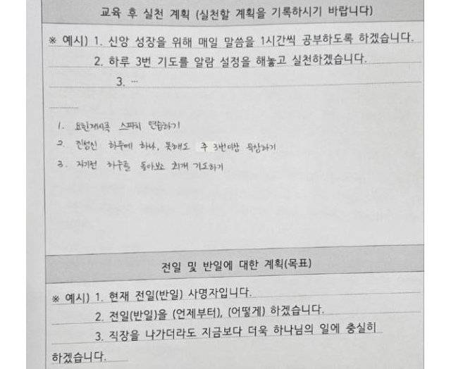 이밖에도 특별교육을 들은 청년 신도들은 이른바 ‘전일·반일 사역 계획서’를 직접 작성해야 했다. 텔레그램으로 공유된 소감문 형식인 계획서에는 ‘언제까지 직장을 다니겠다’ ‘직장을 나가더라도 지금보다 더욱 사역에 충실하겠다’는 등의 문장이 적혀 있었다. A씨는 “계획서를 쓴 뒤에는 ‘너 스스로 하겠다고 하지 않았느냐’며 되레 책임을 전가한다”며 “계속되는 교육과 상담으로 직장생활 자체에 죄책감을 느끼게 만드는 구조”라고 말했다.