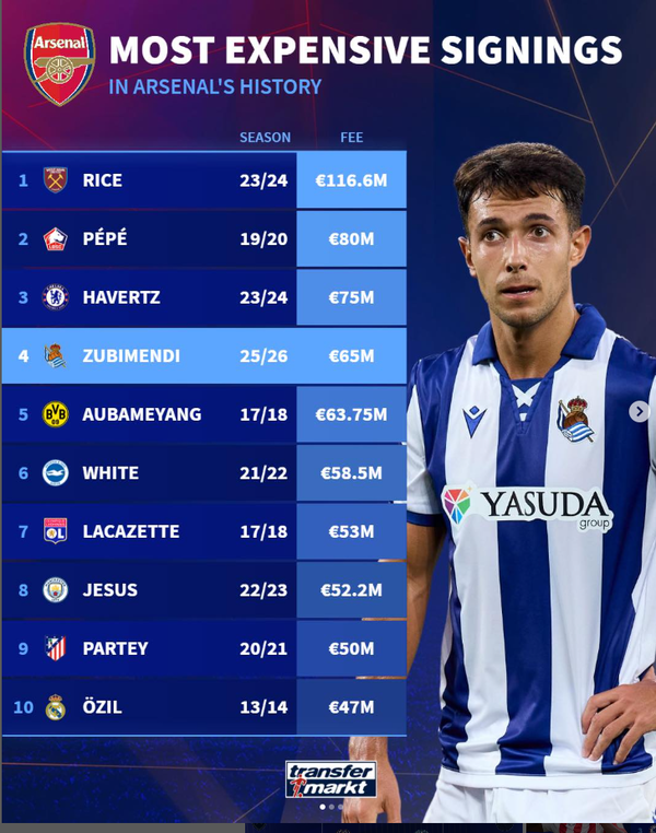 미켈 아르테타 감독이 오랜 시간 원했던 수비형 미드필더 마르틴 수비멘디가 아스널의 유니폼을 입었다. 이적료는 6500만 유로(약 1045억 원)로 전해지고 있고, 이는 아스널 역대 최고 이적료 4위에 해당된다.