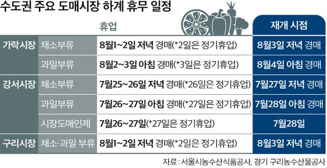 서울시농수산식품공사에 따르면 가락시장 청과부류 중 채소부류는 목요일인 7월31일 저녁까지 경매하고 휴업에 돌입한다. 이후 일요일인 8월3일 저녁부터 경매를 재개한다. 과일부류는 금요일인 8월1일 아침 경매를 끝으로 휴장했다가 월요일인 8월4일 아침에 경매를 다시 시작한다.