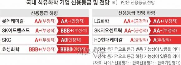 6일 업계에 따르면 신용평가사들은 지난달 석유화학사 네 곳의 신용등급을 잇달아 하향 조정했다. 롯데케미칼은 나이스신용평가·한국신용평가·한국기업평가 세 곳의 신용평가사에서 AA에서 AA-로 신용등급이 내려갔다. 한국신용평가는 SK어드밴스드 신용등급을 기존 A-에서 BBB+로, SKC는 A+에서 A0로, 효성화학은 BBB+에서 BBB0로 내렸다.