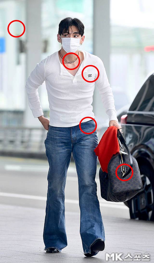 이날 출국길에서 뷔는 듬직한 상체 실루엣이 그대로 살아나는 '딱붙핏' 화이트 셔츠에 나팔바지 디자인의 데님 팬츠를 패치에했고, 큼지막한 여행 가방을 선택해 캐주얼하면서도 세련된 공항패션을 완성했습니다.