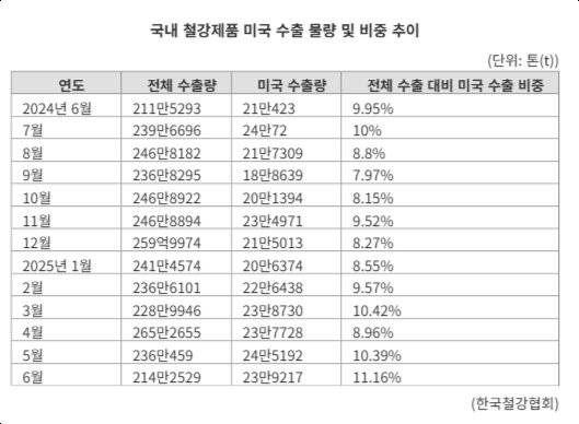 7일 한국철강협회에 따르면 6월 한국의 전체 철강 수출에서 미국이 차지한 비중은 11.17%다. 최근 1년 간(2024년 6월~2025년 6월) 가장 높았다. 이 기간 전체 평균은 9.21%다.