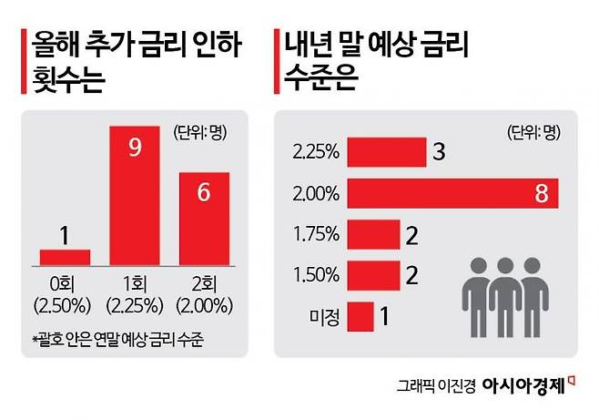 이에 따라 올해 말 최종 금리는 현 수준(연 2.50%)에서 추가 1회 인하하면 도달하는 연 2.25%일 것이란 시각이 9명(56.3%)으로 종전 대비 비율을 키웠다. 공 연구원은 "경기 부양적인 통화 완화 기조가 불가피해 보이나 금리를 더 큰 폭으로 인하할 경우 내외 금리차, 금융안정 우려 등이 부각될 것"이라며 "추가 한 차례 금리 인하가 올해 마지막 금리 인하가 될 것"이라고 말했다. 0.25%포인트씩 추가 2회 인하 시 도달하는 연 2.00%를 전망한 전문가 역시 6명(37.5%)으로 적지 않았으나, 부동산 시장 흐름 등이 변수가 될 것이란 단서를 달았다.