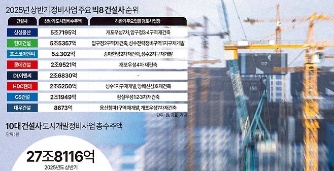 수주고가 이런 열기를 대변한다. 6일 건설업계에 따르면 국내 시공능력평가 기준 10개 대형건설사가 2025년도 상반기 도시개발정비사업 수주액은 총 27조8116억원이었다. 불과 반년 만에 전년도 전체 수주액인 27조8700억원의 99% 이상의 성과를 냈다.