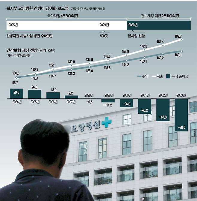 시범사업은 국가 예산을 재원으로 하고 있지만, 본사업으로 바뀌면 건강보험 재정이 투입된다. 이에 따라 요양병원 간병비 급여화의 필요성은 인정되지만, 재원이 되는 건강보험이 올해부터 수지 적자에 들어설 것이라는 점 등을 감안하면 지속가능성에 대한 방안 마련도 함께 고민돼야 한다는 지적이 나온다.