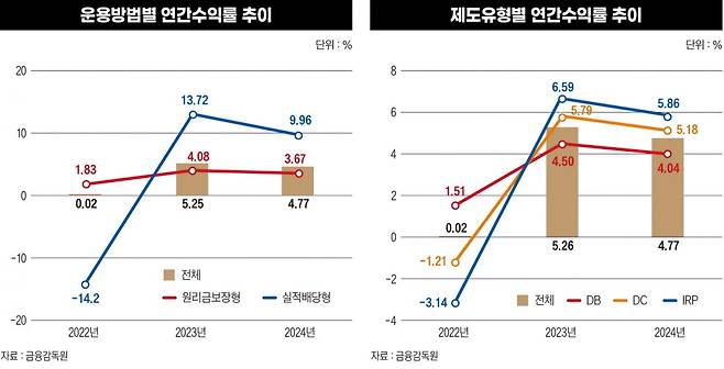 지난해 퇴직연금 연간 수익률은 4.77%. 최근 1~2년은 시장 반등에 힘입어 성과가 좋았지만 퇴직연금은 장기 운용을 전제로 한 자산이라는 점에서 평균수익률을 보면 얘기가 달라진다. 2024년 말 기준 퇴직연금 적립금의 전체 10년 평균수익률은 2.31%, 5년 평균수익률은 2.86%다. 같은 기간 정기예금 금리가 3%대라는 점을 감안하면 예금보다도 못한 운용 성과다.