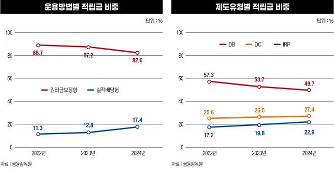 2024년 말 기준 전체 퇴직연금 적립금 가운데 무려 83%가 원리금보장 상품에 묶여 있다. 특히 DB형(확정급여형)의 경우 이 비율은 93%에 달한다. 퇴직연금 제도가 시행된 지 20년이 지났지만 자산 운용은 예금 수준에 머물고 있다.