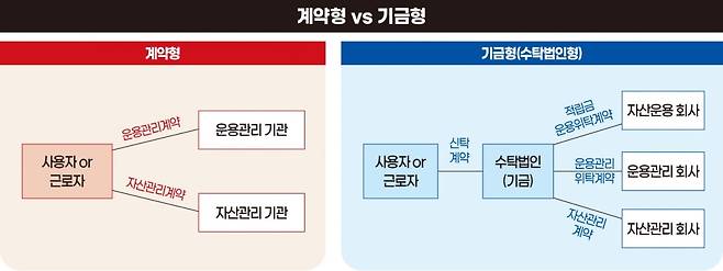 이 공적연금의 간극을 줄일 해법으로 주목받는 것이 ‘기금형 제도’다. 기금형은 여러 가입자의 퇴직연금을 모아 집합적으로 운용하는 방식이다. 대표적 사례가 국민연금 방식이다. 반면 현행 제도는 민간 금융사와 기업이 계약을 맺는 ‘계약형 구조’다. 이 방식에선 가입자가 스스로 투자 상품을 선택하고 관리해야 한다.