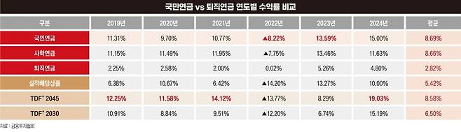 실제 같은 퇴직연금 제도 안에서도 국민연금과 유사한 자산배분전략을 구사하는 자산배분형 실적상품, 특히 TDF(Target Date Fund)의 수익률을 보면 상황은 달라진다. 대표적인 TDF2045의 경우 2019~2024년 6년 평균 수익률은 8.58%로 국민연금(8.69%)과 거의 유사한 수준이다. 특히 이 기간 중 2022년과 2023년을 제외한 나머지 4개 연도에서는 TDF2045가 국민연금보다 더 높은 수익률을 기록했다. 계약형 제도 내에서도 운용 전략만 잘 세우면 경쟁력 있는 성과를 낼 수 있다는 사실을 방증한다.