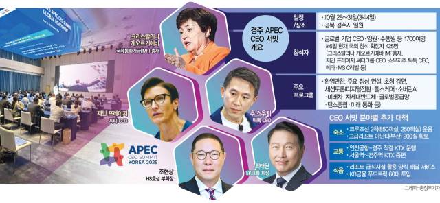 7일 대한상공회의소 ‘APEC CEO 서밋 2025’ 사무국에 따르면 10월 28일 경주 화랑마을에서 만찬을 시작으로 경제인 행사가 막을 올린다. 이튿날인 29일 최태원 SK그룹 회장 겸 대한상의회장이 CEO 서밋 의장으로 환영사를 한 뒤 정상급 인사의 특별 연설과 ‘세계 경제 이슈와 도전’을 주제로한 기조연설이 이어진다. 이후 마지막 날까지 세션별 전문가와 기업인들의 연설과 토의 등이 숨 가쁘게 열린다.