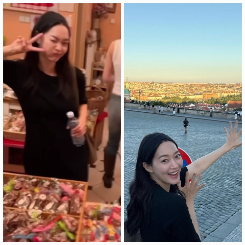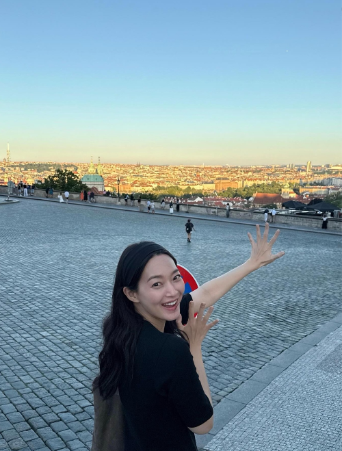 도시의 전경을 향해 손을 뻗은 첫 사진은, 프라하 언덕 어딘가에서 찍은 듯했다. 이마를 넘긴 검정 헤어밴드와 같은 색 원피스, 그리고 입꼬리를 감싼 미소는 그림처럼 차분했다. 손가락을 활짝 펼친 포즈엔 설렘도, 장난도 담겨 있었다.