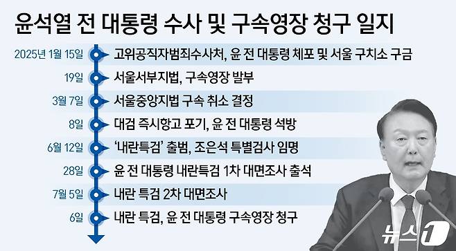 (서울=뉴스1) 양혜림 디자이너 = 내란 특검팀은 6일 오후 5시 20분 서울중앙지법에 윤석열 전 대통령에 대한 구속영장을 청구했다. 전날(5일) 윤 전 대통령에 대한 2차 소환 조사 하루 만에 '신병 확보'에 나선 것이다. 구속영장 발부에 대한 법원의 판단에 따라 향후 특검의 수사 속도가 좌우될 것으로 예상된다.