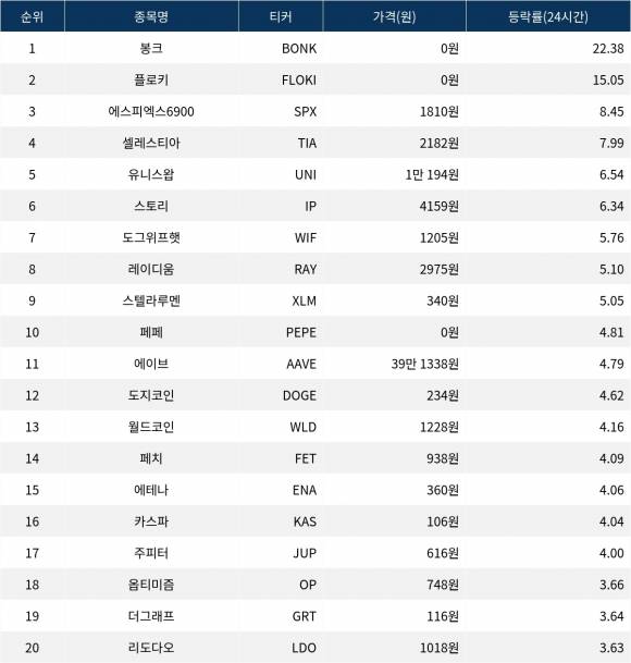 [서울데이터랩]봉크·플로키·에스피엑스6900, 24시간 상승률 상위
