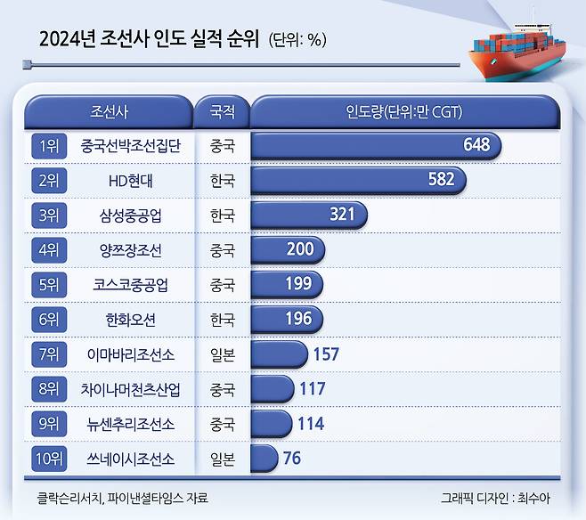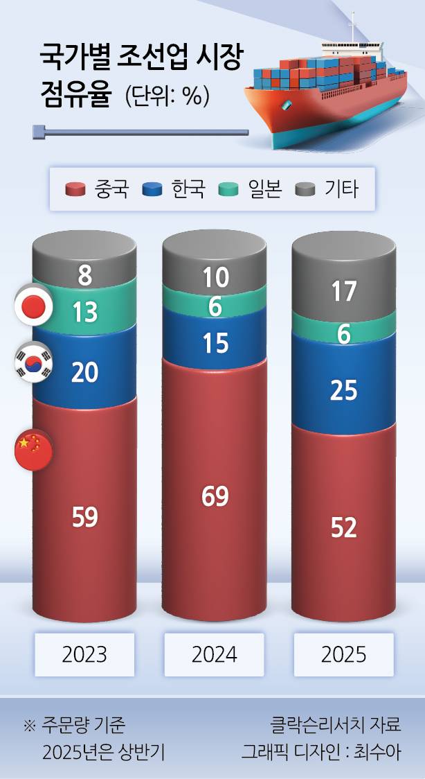 국내 조선사들은 최근 글로벌 선박 시장에서 중국에 밀려 고전하고 있다. 과거에는 가격 경쟁력 외에는 뚜렷한 장점이 없었던 중국 조선사들이 국내 조선사들을 위협할 만한 건조 기술력을 앞세워 시장 선두 자리를 차지하고 있다. 올해 상반기 글로벌 선박 시장에서 중국은 1004만CGT(표준화물선환산톤수)를 수주, 점유율 52%를 달성했다. 우리나라(487만CGT)는 25%에 머물렀다.