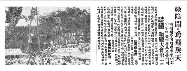무려 1만여 명의 관중. 당시 경성의 인구가 30만 명이었으니 엄청난 관중이 모인 잔치였던 모양이다. 이 추천 경기의 기사 중에 특히 눈에 띄는 것은 첫날 기사의 ‘녹음(綠陰) 간에 연비여천(鳶飛戾天)’이란 제목이다. 이는 시경(詩經)에 나오는 구절로, ‘연비여천(鳶飛戾天), 어약우연(魚躍于淵)’ 즉 하늘에 솔개가 날고 물속에 고기가 뛰어노는 것이 자연스럽고 조화롭다는 뜻으로 이를 줄여 ‘비약(飛躍)’이라고 한다. 즉 솔개와 물고기처럼 모두 저마다의 법칙에 따라 자연스럽게 살아가면 전체적으로 천지와 조화를 이루게 된다는 취지를 담고 있다고 한다.