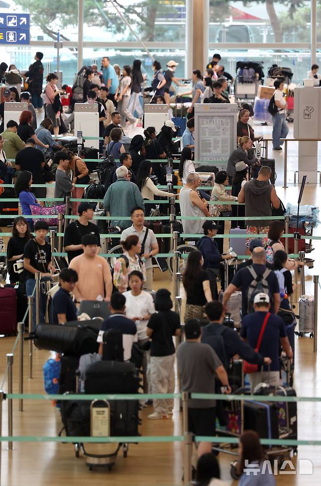 [인천공항=뉴시스] 김선웅 기자 = 7일 인천국제공항 제1여객터미널 출국장에서 여름 휴가철을 맞아 출국하는 여행객들이 출국 수속을 밟고 있다. 2025.07.07. mangusta@newsis.com