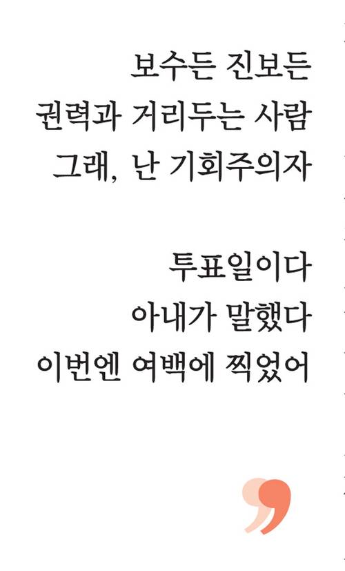 드디어 투표일이 왔다. 책장을 건성으로 넘기던 성준은 냉랭함이 가시지 않은 아내를 달래 사이좋게 투표소로 향했다. 늦은 오후였다. 줄이 길었다. 투표용지는 하자 열전(瑕疵 列傳)이었다. 도장을 찍을 엄두가 나지 않았다. 그래도 가정의 평화를 위해, 꼴통 보수라는 딱지를 떼기 위해 성준은 기회주의적 도장을 꾹 눌렀다. 아내의 표정은 밝았다. 사소한 기대마저 버리고 다 내려놓은 사람의 표정이 그럴까. 성준은 이번만은 쉽게 답할 수 있다는 자신감에 한결 마음이 가벼웠다. 단골 식당에 들렀다. 확실히 말해주리라. 아내가 가라앉은 목소리로 말했다. 사랑하는 사람에게 고백하는 목소리가 그럴까. “이번에는 사표, 여백에 찍었거든. 당신은?” 성준의 눈빛이 아득해졌다. 투표를 마친 손님들이 홀가분한 표정으로 식당에 몰려들었다.