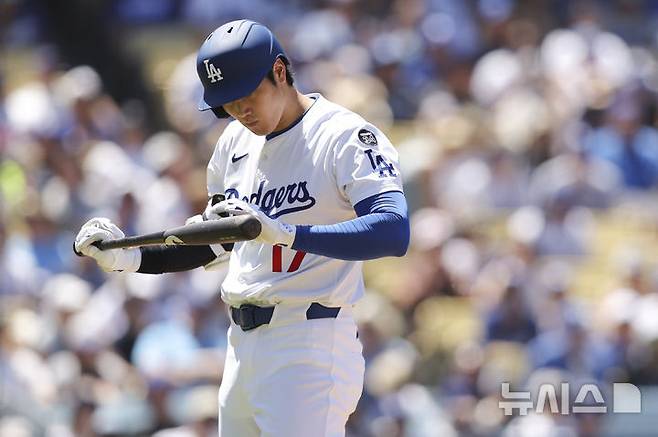 [로스앤젤레스=AP/뉴시스] LA 다저스 지명타자 오타니 쇼헤이가 6일(현지 시간) 미 캘리포니아주 로스앤젤레스 다저 스타디움에서 열린 2025 메이저리그 휴스턴 애스트로스와의 경기 5회 말 타석에서 배트를 살펴보고 있다. 오타니는 두 번의 헛스윙과 두 차례 파울 끝에 3루수 뜬공으로 물러났다. 2025.07.07.