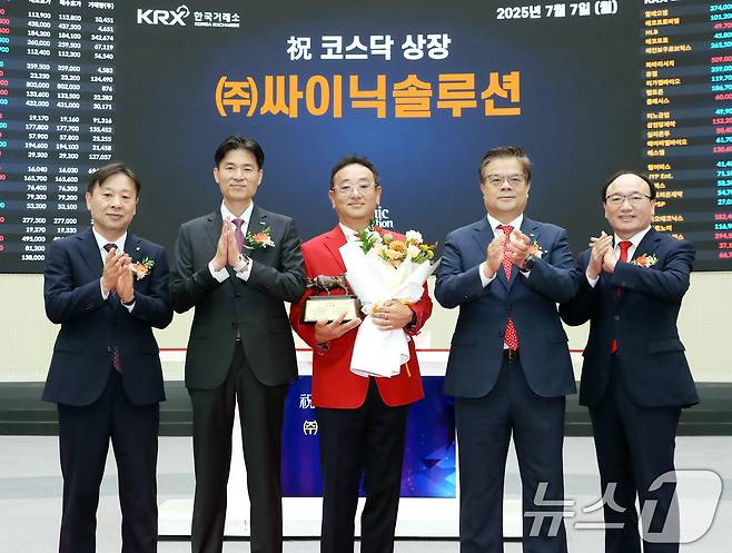 (서울=뉴스1) = 7일 서울 영등포구 한국거래소에서 열린 싸이닉솔루션 코스닥시장 상장기념식에서 유도석 한국IR협의회 상무(왼쪽부터), 민경욱 한국거래소 코스닥시장본부장, 이 현 싸이닉솔루션 대표이사, 오익근 대신증권 대표이사, 강왕락 코스닥협회 부회장이 기념 촬영을 하고 있다. (한국거래소 제공. 재판매 및 DB 금지) 2025.7.7/뉴스1