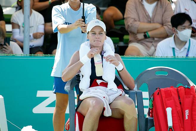 <사진. WTA 500 코리아오픈에서 얼음수건을 목에 둘렀던 베로니카 쿠데르메토바(러시아)>
