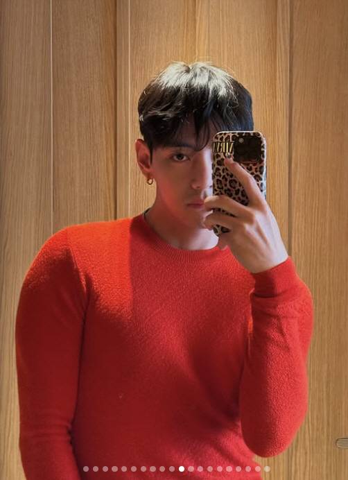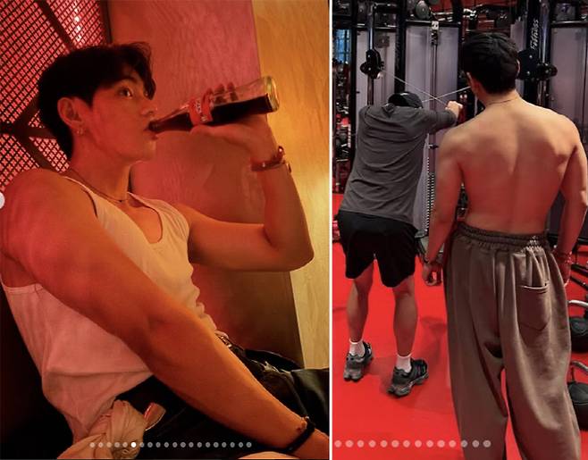 사진 속에서 뷔는 전역 이후 눈에 띄게 달라진 근육질 몸매를 다양하게 보여줬다.