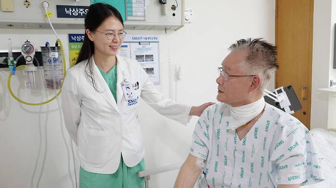 ▲ 서울대병원 심장혈관흉부외과 박샘이나 교수와 로봇 폐 이식 수술을 받은 윤병섭 환자