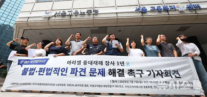 [서울=뉴시스] 최진석 기자 = 7일 서울 중구 서울지방고용노동청 앞에서 열린 아리셀 중대재해 참사 1년 불법·편법적인 파견 문제 해결 촉구 기자회견에서 참석자들이 구호를 외치고 있다. 2025.07.07. myjs@newsis.com