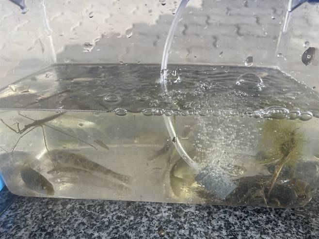 길지 않은 채집 끝에 간이 수족관이 만들어졌다. 모래무지, 돌마자, 얼룩동사리, 밀어, 피라미, 잉어, 메기 등으로 내부가 북적였다. 피라미 한 마리가 갑자기 수족관 밖으로 튀자 "으악!" 놀라는 소리와 함께 웃음이 터졌다. 스마트폰 속 게임이나 영상이 없어도 즐거워하며 자연관찰에 몰두한 모습이었다.