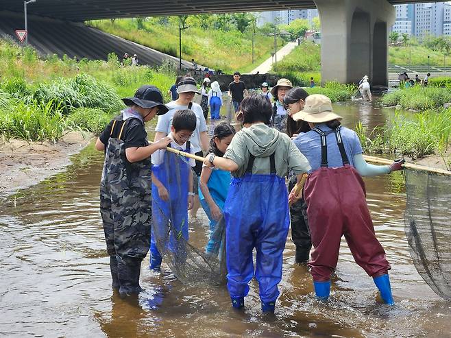 참가자들은 그저 구경만 하는 체험이 아닌 물속으로 직접 들어가 생명을 만나는 일에 나섰다. 어떤 아이들은 가슴까지 올라오는 장화를 신고도 거침이 없었고, 어떤 아이는 족대를 처음 다뤄보는 생소함에 잠깐 머뭇거리기도 했다. 하지만 누구 하나 포기하지 않았다. "내가 몰아줄게!", "이쪽으로 와봐!" 서로 외치며 아이들은 팀을 이루고 족대를 들고 물속으로 들어갔다.