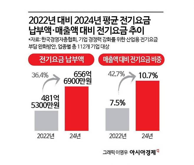업체별로 보면 LG화학은 올해 전기요금을 2023년과 비교해 653억원을 더 내야 한다. 에쓰오일도 연 642억원을 더 납부해야 하는 실정이다.