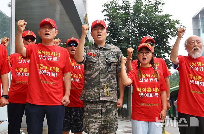 [서울=뉴시스] 황준선 기자 = 해병대 예비역 연대 회원들이 7일 오전 서울 서초구 이명현 순직 해병 특별검사 사무실 앞에서 순직 해병 사건 진상 규명 촉구 기자회견을 열고 구호를 외치고 있다. 2025.07.07. hwang@newsis.com