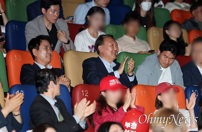 | ▲ 윤석열 전 대통령이 5월 21일 오전 서울 메가박스 동대문에서 영화 ‘부정선거, 신의 작품인가’ 관람을 마치며 박수치고 있다. 왼쪽부터 감독 이영돈 피디, 윤 전 대통령, 제작 전한길 전 강사. |