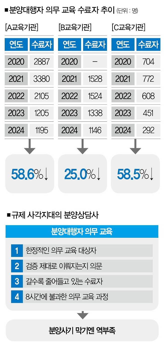 분양대행자 의무교육 기관 관계자는 "분양대행자 의무 교육에 사각지대가 있는 건 사실"이라며 "의무 교육을 받는 분양대행자가 갈수록 줄어들고 있다"고 말했다.