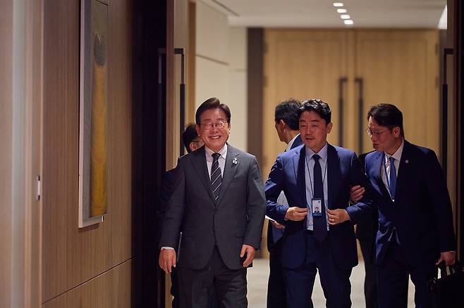 | ▲ 이재명 대통령이 6월 19일 서울 용산 대통령실 청사에서 강훈식 비서실장 등 참모들과 함께 이동하고 있다. |
