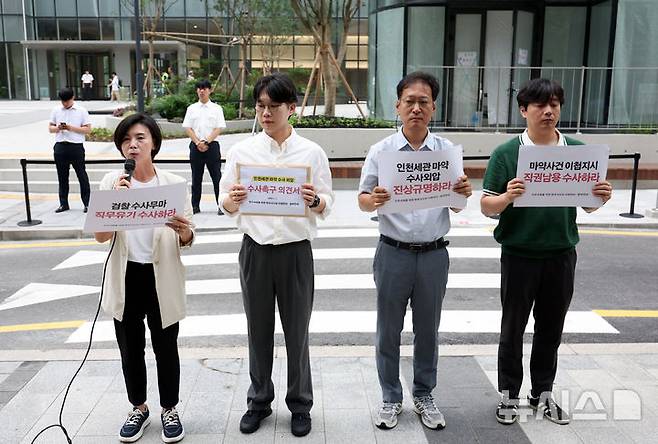 [서울=뉴시스] 조성우 기자 = 민주사회를 위한 변호사모임 사법센터와 참여연대가 7일 오전 윤석열 전 대통령의 부인 김건희 여사 의혹을 수사하는 민중기 특별검사팀 사무실이 있는 서울 종로구 KT광화문빌딩 웨스트 앞에서 인천세관 마약 수사 외압 수사 촉구 의견서 제출 기자 브리핑을 하고 있다. 왼쪽부터 이은미 참여연대 권력감시2팀장, 백해룡 경정의 법률대리인 이창민 변호사, 이재근 참여연대 협동사무처장, 장범식 변호사. 2025.07.07. xconfind@newsis.com