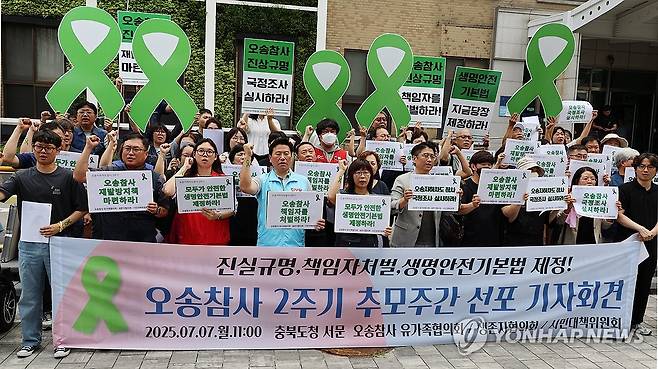 (청주=연합뉴스) 이성민 기자 = 오송참사 유가족·생존자협의회가 7일 오전 충북도청 앞에서 참사 2주기 추모 주간 선포 기자회견을 열고 있다. 2025.7.7