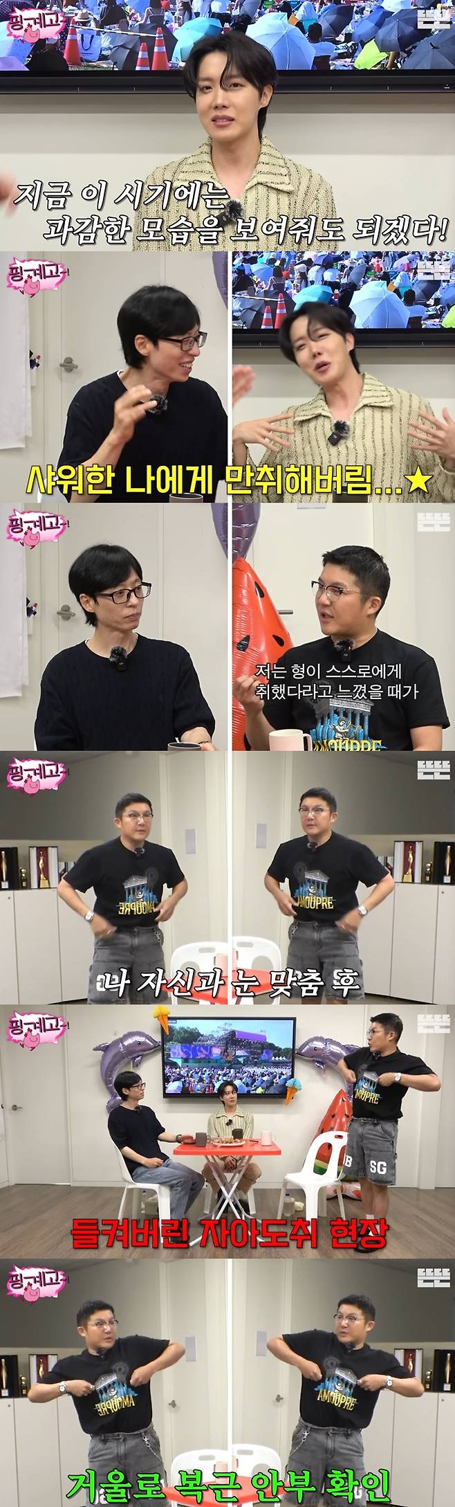 샤워 후 본인에게 취하는 나이대인 것 같다고 고백한 제이홉의 말을 들은 유재석은 "그런 시기가 있다. 전 애초에 술을 잘 못하지만 많이 취한 적도 없다. 솔직히 그렇게까지 심취한 적은 없지만 가끔 샤워하고 취한다"고 고백했다.
