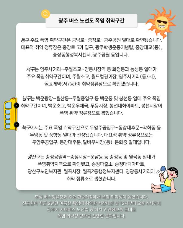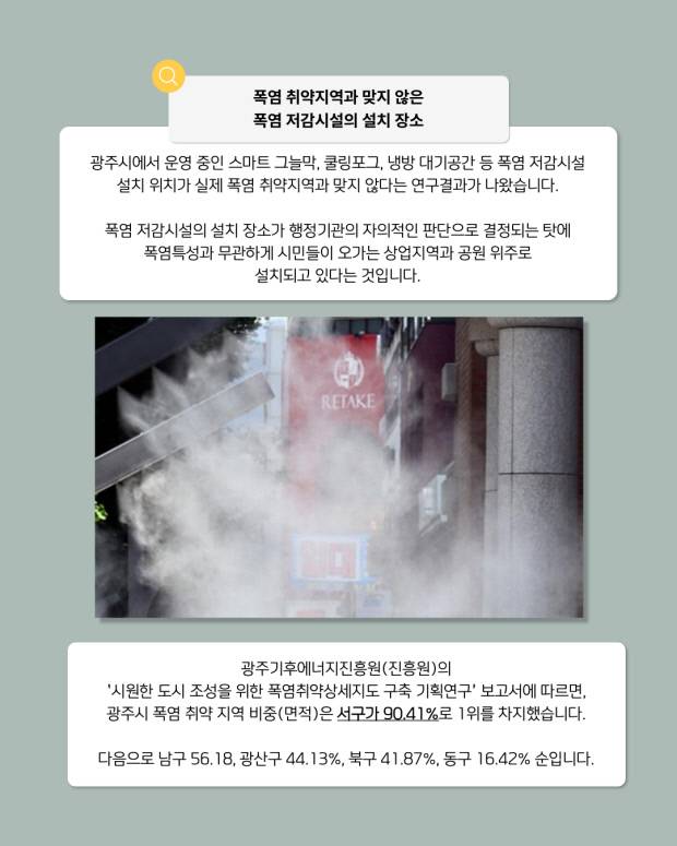 열돔 현상이 심화하고 있지만 광주시에서 운영 중인 스마트 그늘막, 쿨링포그, 냉방 대기공간 등 폭염 저감시설 설치 위치가 실제 폭염 취약지역과 맞지 않다는 연구결과도 나왔습니다.